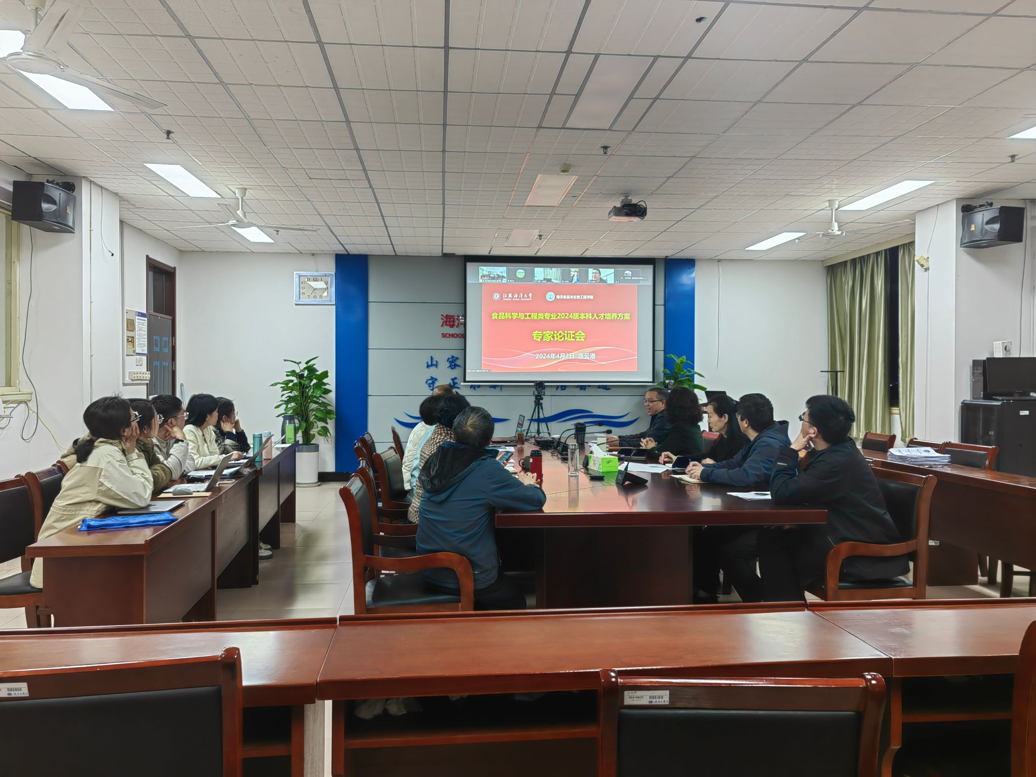 论证会邀请江南大学食品学院夏文水教授、中国海洋大学食品科学与工程学院副经理李振兴教授、连云港福润食品有限公司总经理赵士勇高级工程师、连云港市市场监督管理局伏卫民处长、连云港质量技术综合检验检测中心主任钱亮亮高级工程师、中洋鱼天下食品(南通)有限公司总经理徐逍高级经济师、江苏省紫菜协会戴卫平秘书长、江苏鼎味泰食品股份有限公司副总经理冯志浩、益海(连云港)粮油食品有限公司总经理潘元兵作为校外论证专家。其中,夏文水教授担任专家组组长。学校教务处副处长吴美玉、学院经理王淑军、副经理盘赛昆和吴少杰,食品工程系主任王灵昭、副主任王文彬以及食品工程系全体教师参加了论证会。